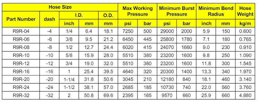 4 lớp thép xoắn cường lực (high-tensile spiral steel wire) – đan xen ngược chiều, giúp ống chịu được áp lực rất cao và xung áp lớn trong hệ thống thủy lực.